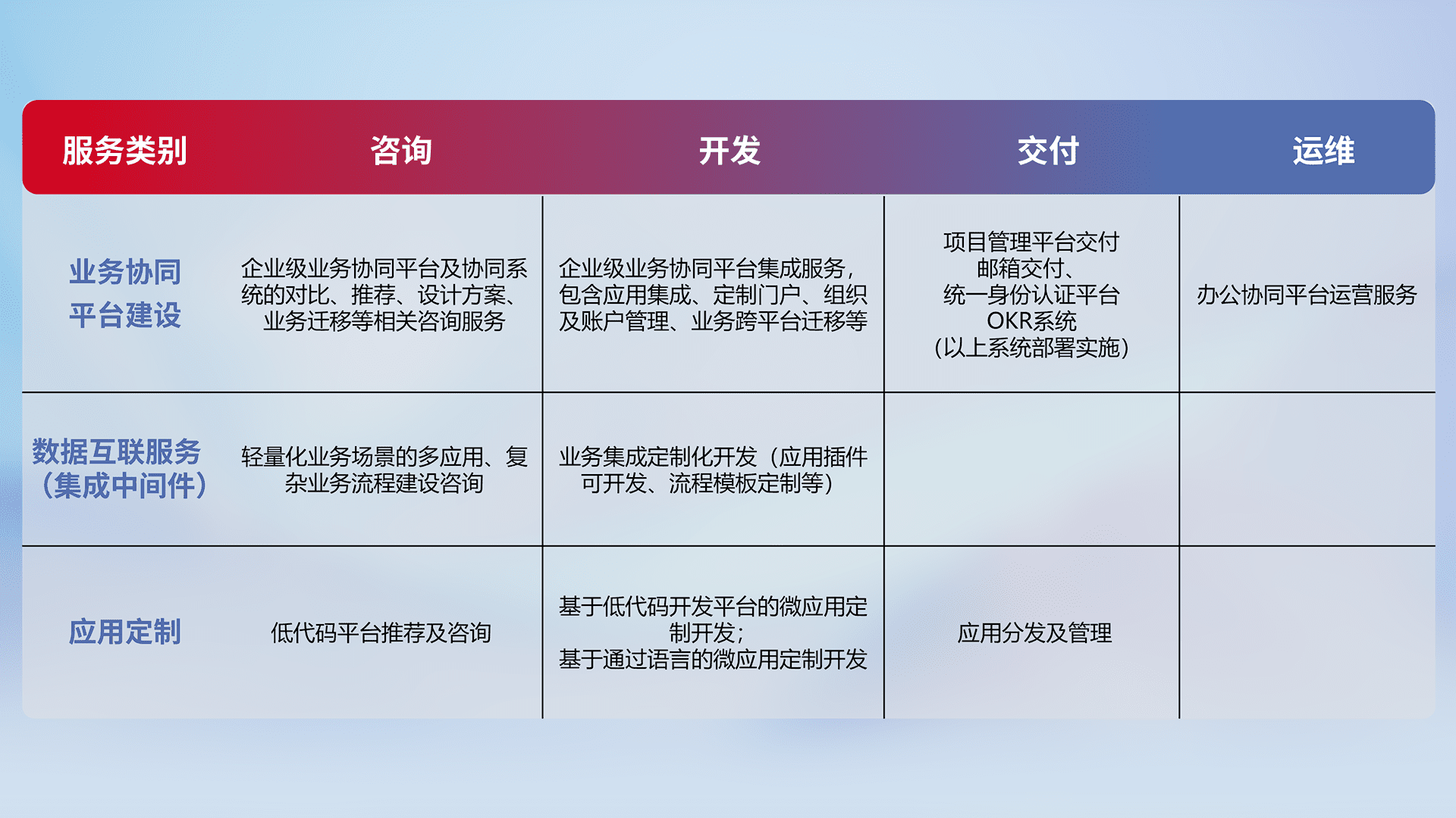 针对钉钉、、、企微、、、、IDaas等平台级产品提供产品的规划、、方案、、交付、、、、定制化开发等服务,,实现如统一协同办公、、、、智能客户服务、、混合会议管理、、、、智能数据查询、、、、等业务场景,,实现数字化转型。。